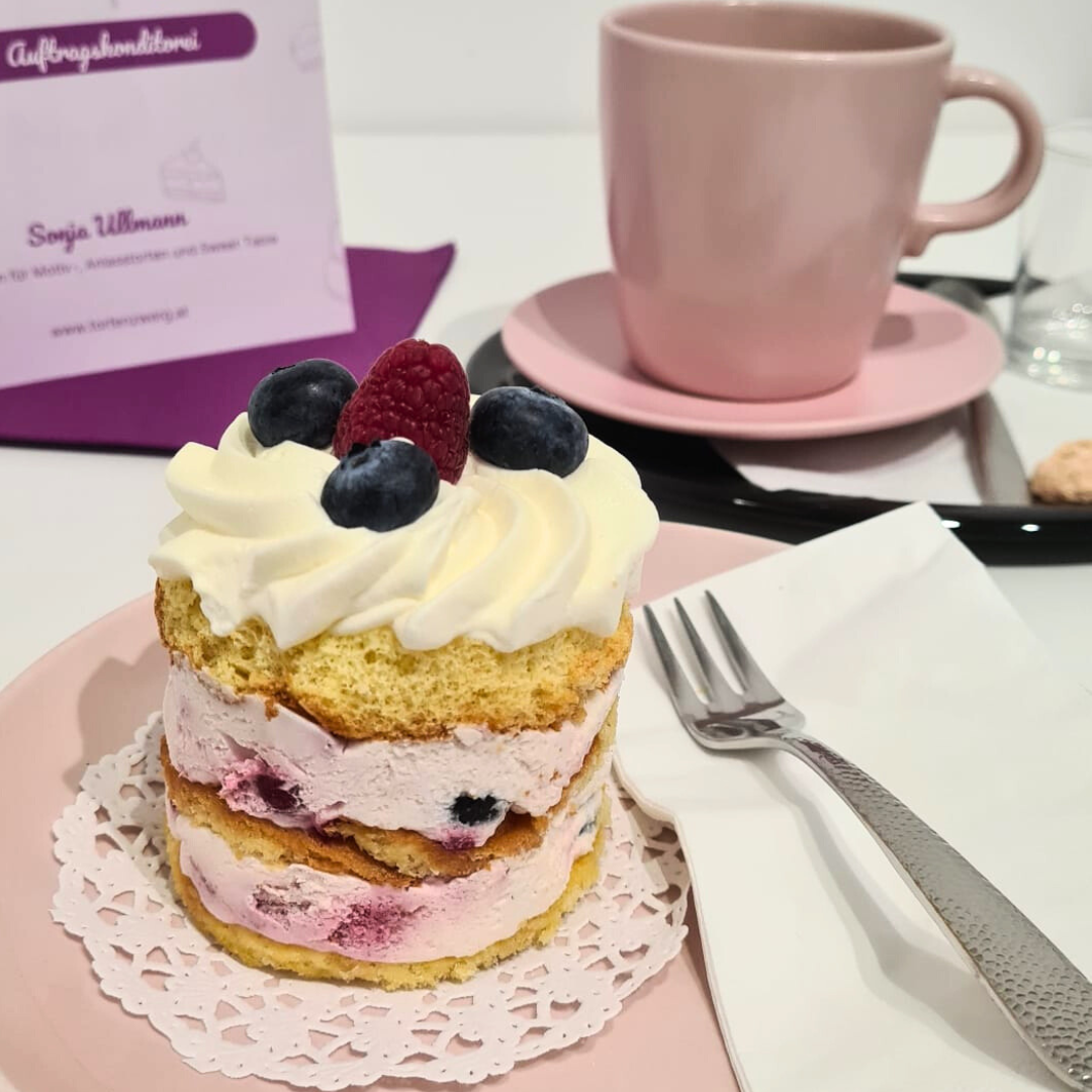Unser Wochenend-Schmankerl wechselt jede Woche und wird mit viel Liebe frisch gebacken. Außerdem kannst du dich auch wöchentlich auf ein veganes Schmankerl freuen. Dieses Mal wartet auf dich eine echte Geschmacksexplosion: Tortenzwerg mit Topfen-Oberscreme und Waldbeeren (A,C,G)
